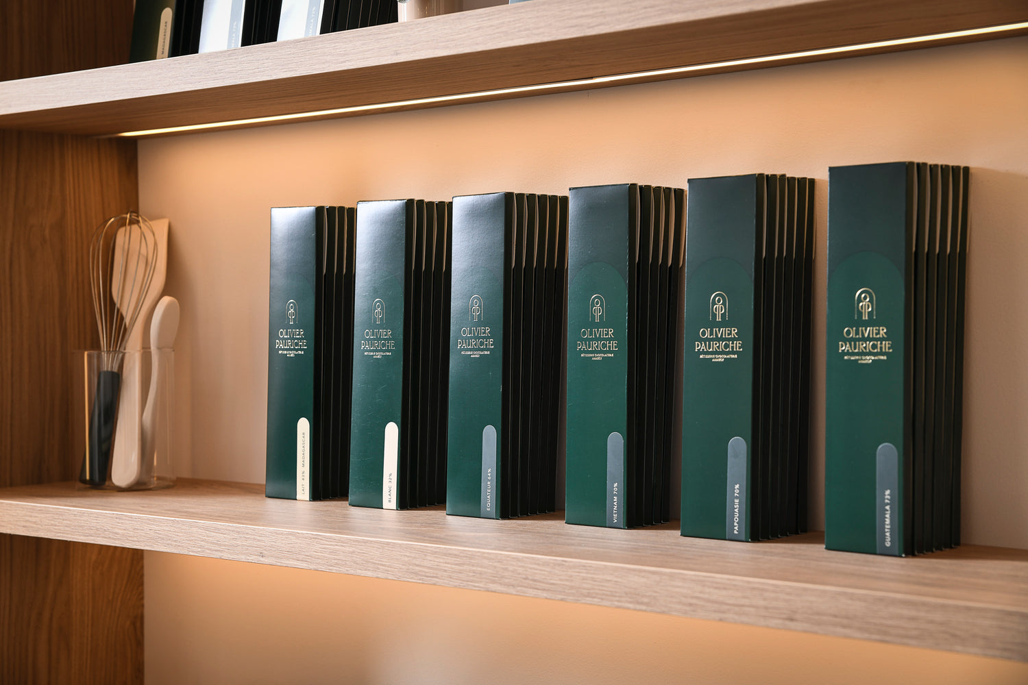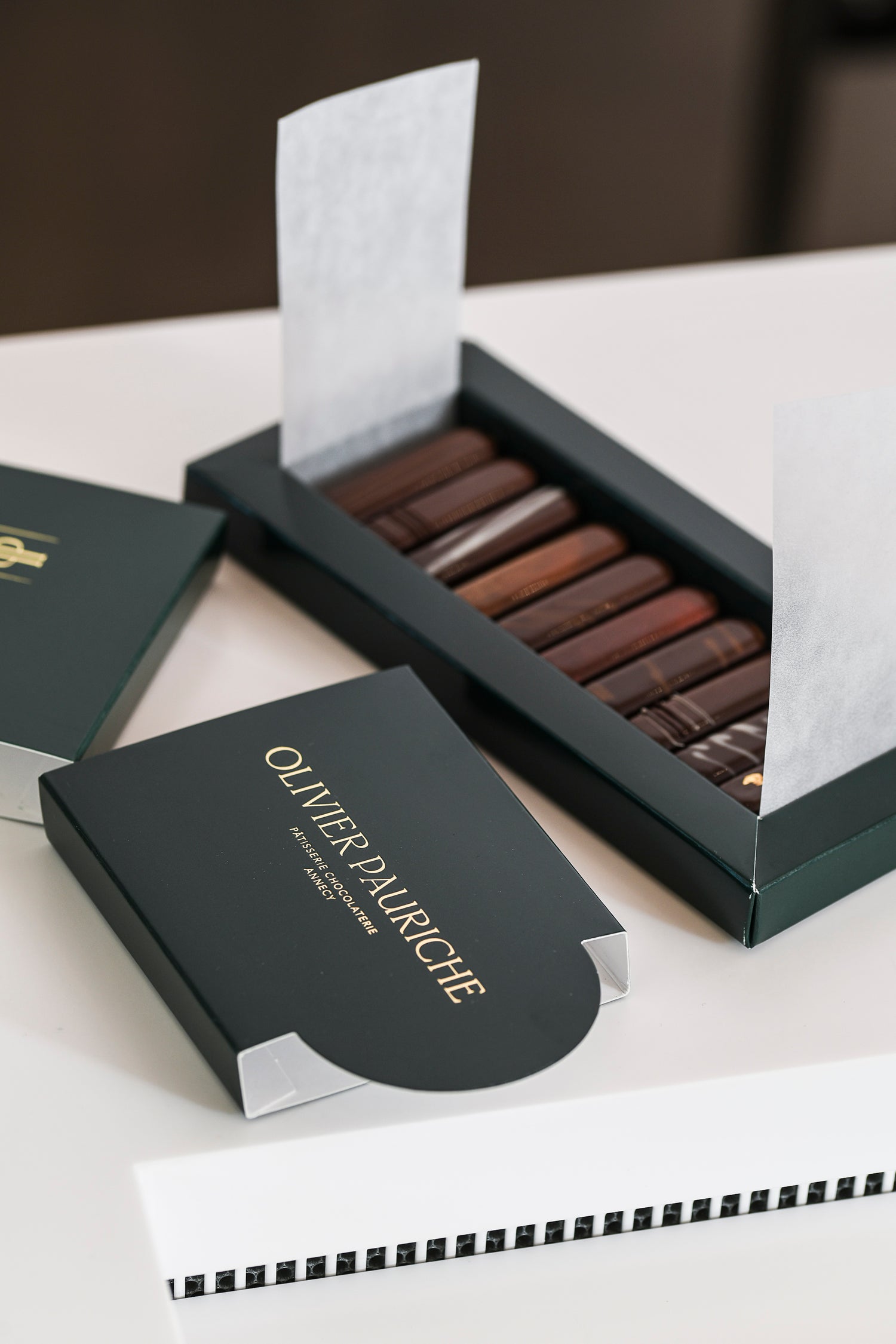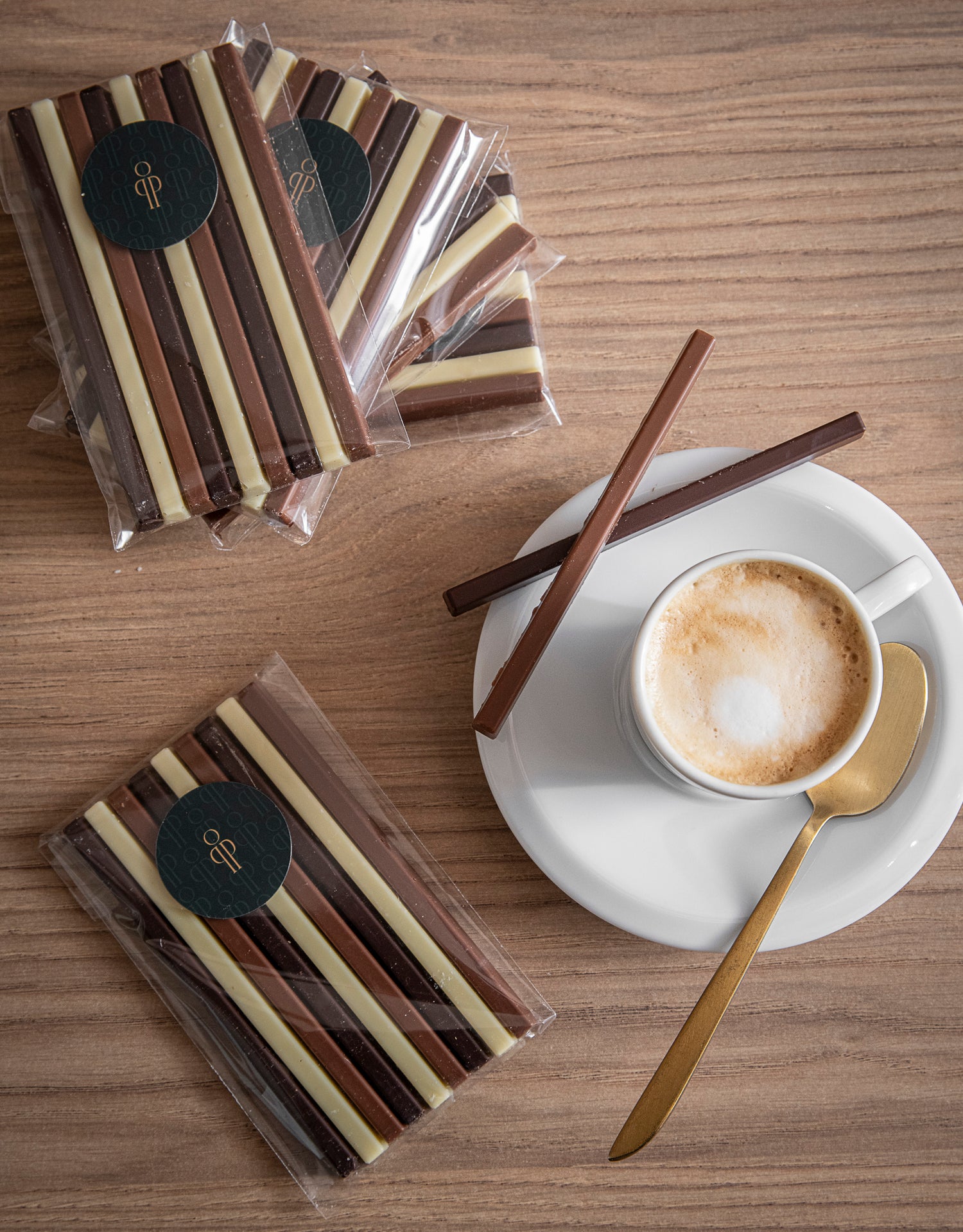 Fini les carrés de chocolat, Olivier Pauriche vous propose des fines barres au chocolat blanc, noir ou au lait pour accompagner vos boissons à toute heure de la journée.